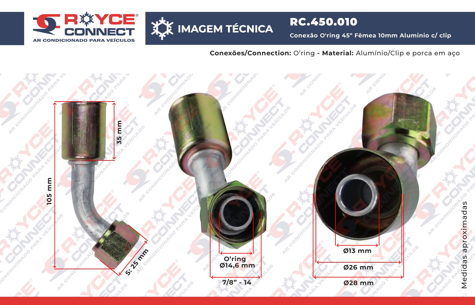 Conexão O'ring 45º Fêmea 10mm Aluminio c/ clip
