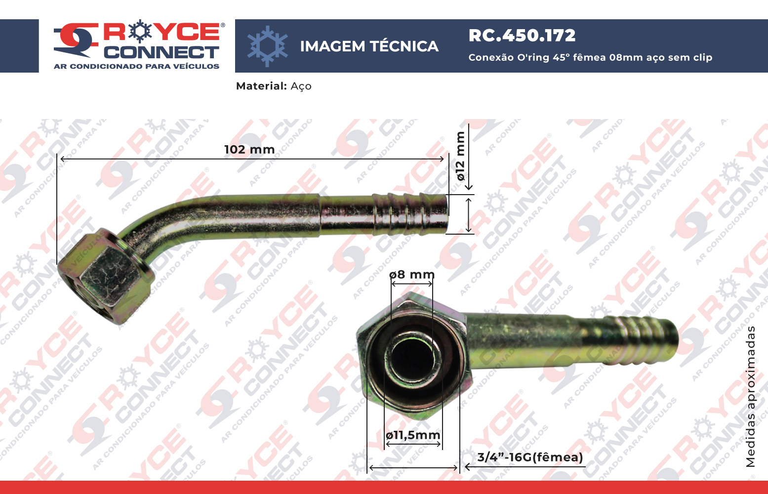 Conexão O'ring 45º Fêmea 08mm Aço s/ Clip