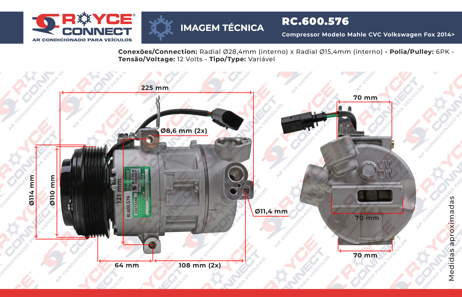 Compressor Modelo Mahle CVC Volkswagen Fox 2014> / Gol G7 2016> / UP 2014>/ Voyage 2017> - 12 Volts Polia 6pk 114mm OEM: 5U0820803M